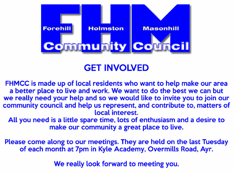 Come to our meetings. FHMCC meet on the last Tuesday of each month at 7pm in Kyle Academy and we extend a warm welcome to local residents.