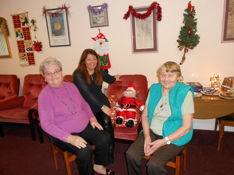 Much to the delight of the Orchard and Hamilton House Residents, Forehill, Holmston and Masonhill Community Council presented a Christmas gift of chocolates to each of the 35 households. FHMCC Chairperson, Lynne Thomson, seen here with two Orchard House Residents, took the parcels along on the day of their Christmas Party. The Residents would also like to thank their local South Ayrshire Councillor, Corrie Wilson, for her annual gift of a delicious hand made and decorated Christmas cake.